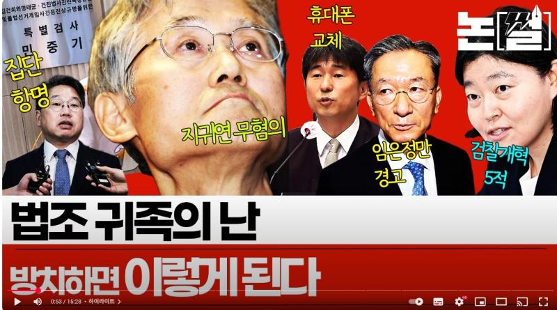 최근 내란 수사와 검찰,사법부 개혁이 진행되는 상황에서도 조희대 사법부와 검찰이 국회와 국민들을 기만하고 조롱하는 수위가 날로 심각해지고 있다. 우리는 작금의 사태가 마치 3~4년 전 검찰총장이 된 윤석열과 검찰이 보여주었던 때와 유사한 느낌을 떨칠 수가 없다. 이런 상황에서 한겨레TV 논썰의 이재성 기자가 쏘아올린 〈검찰·사법개혁 본질은 민주주의 투쟁, 노예 근성을 끊어내야〉라는 유튜브 칼럼은 작금의 검찰과 사법부 난동에 대한 본질을 꿰뚫어 보는 통찰력을 잘 보여주고 있어 칼럼 주요 내용을 소개한다.