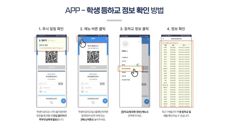 엔트랙 시스템의 첫 번째 핵심 축은 '안심 알리미'다. 이는 학생의 등하교 상황을 실시간으로 학부모에게 전달해 통학 중 발생할 수 있는 위험을 예방하는 데 결정적인 역할을 한다.