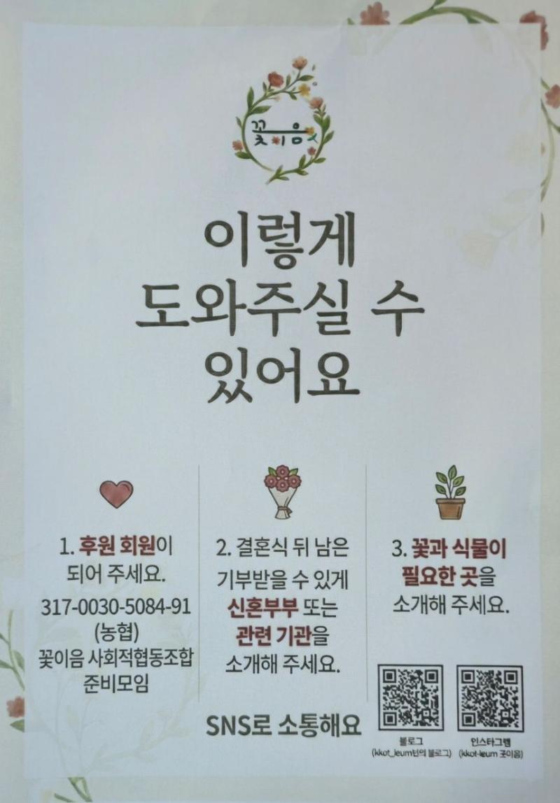 또 다른 하나는 수많은 사회적협동조합이 대부분 그러하듯이 초기 재정난에 허덕이며 참여하는 개개인들의 선한 열정과 에너지에 기반하여 힘겹게 꾸려간다는 걸 너무 잘 알기에 걱정이 되는 것도 사실이다. 그래서 부득이하게 꽃이음사회적협동조합 창립총회에서 가져 온 후원방법 안내장을 소개하는 것으로 기사를 마친다.