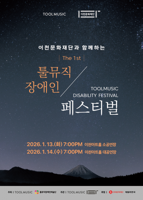 장애 음악인의 가능성을 무대와 직업으로 확장해 온 사회적기업 툴뮤직이 이천문화재단과 함께 ‘제1회 툴뮤직장애인페스티벌’을 개최한다. 이번 페스티벌은 오는 1월 13일과 14일 이천아트홀에서 이틀간 열리며, 전 공연은 무료로 진행된다.