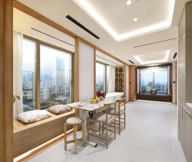 홈플릭스 Living OS가 적용된 주거 공간 내부. 한옥의 여백과 자연 소재에서 영감을 받은 원목 인테리어 안에, 환경 인지·제어 기술이 보이지 않게 내장된 것이 특징이다