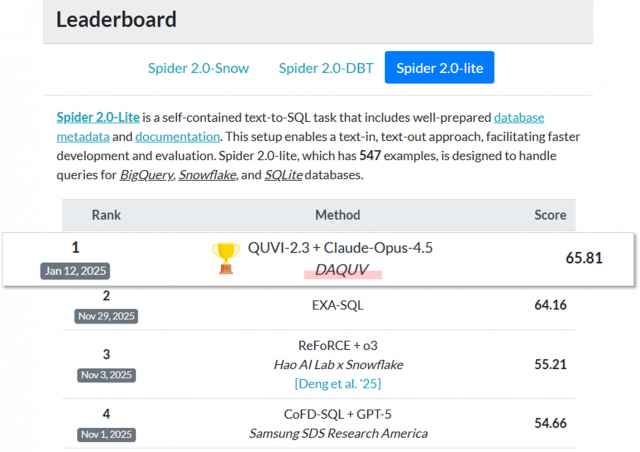 다큐브(대표 윤예지)가 국제 Text-to-SQL 성능 평가 지표인 ‘Spider 2.0’의 Lite 부문에서 세계 1위를 기록했다고 20일 밝혔다. 이는 지난해 7월 DBT(Data Build Tool) 부문 1위에 이은 두 번째 성과로, 국내 기업 최초로 국제 무대에서 두 개 부문 정상을 차지했다.