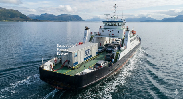 * 선박용 교체식 배터리 시스템: 컨테이너나 세미트레일러 형태로 선박에 탑재돼 필요할 때 교체·충전 후 재적재가 가능한 독립 모듈형 배터리 시스템으로, 기존 고정형 배터리와 달리 운항 일정과 무관하게 충전·교체가 가능하며 선박 환경 변화에도 유연하게 대응 가능