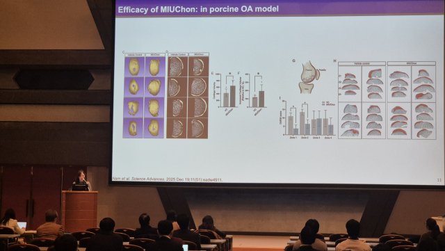 이 같은 국제 학술 무대에서 임예리 교수는 iPSC 기술을 실제 환자 치료로 연결한 임상 연구 사례를 제시했다. 임 교수는 MIUChon의 임상 투여 전략과 함께 무작위 대조·위약 대조·이중맹검(randomized, placebo-controlled, double-blind) 설계를 기반으로 한 임상 연구 구조를 설명하고, 이를 통해 확보된 안전성 및 유효성 평가 결과를 소개했다. 특히 MRI 기반 연골 구조 변화 분석과 통증 감소, 관절 기능 개선 등 주요 임상 지표를 중심으로 연구 성과를 체계적으로 발표했다.