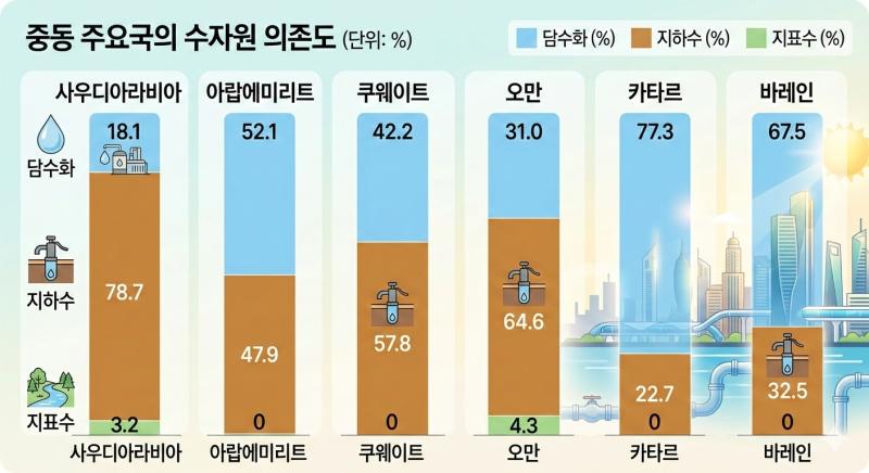 * GCC 국가별 담수화 의존도 - 출처: GWI DesalData / AQUASTAT(2026년 추정치)