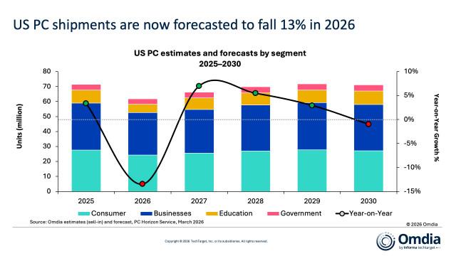 옴디아는 미국 PC 출하량이 2026년 약 6190만 대로 13% 하락한 뒤 2027년에 이르러서야 완만한 회복세를 보일 것으로 내다봤다.