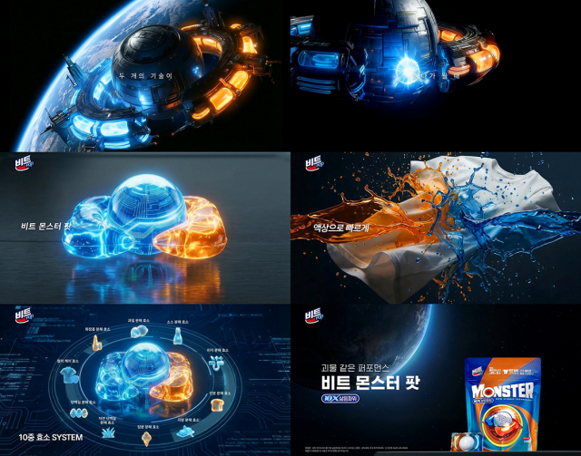 캠페인의 메인 테마인 ‘두 개의 기술이 하나가 될 때’ 편은 우주를 배경으로 주황색과 파란색의 두 에너지가 결합되며 괴물 같은 세척 퍼포먼스를 갖춘 비트 몬스터 팟이 탄생하는 과정을 블록버스터급 스케일의 영상미로 담았다.