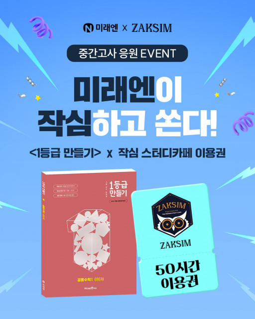 미래엔은 중간고사를 준비하는 학생들이 ‘1등급 만들기’와 함께 시험 범위를 꼼꼼히 대비하고, 작심 스터디카페에서 더욱 몰입감 있게 공부하길 바라는 마음으로 이번 이벤트를 기획했다며, 앞으로도 학습 효과를 높일 수 있는 실질적인 지원을 이어가겠다고 밝혔다.