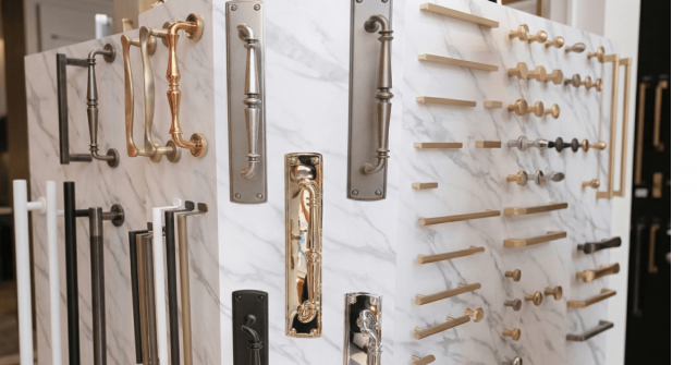 성진철물 매장에서 다양한 방문손잡이와 주물손잡이를 비교할 수 있는 전시 모습
