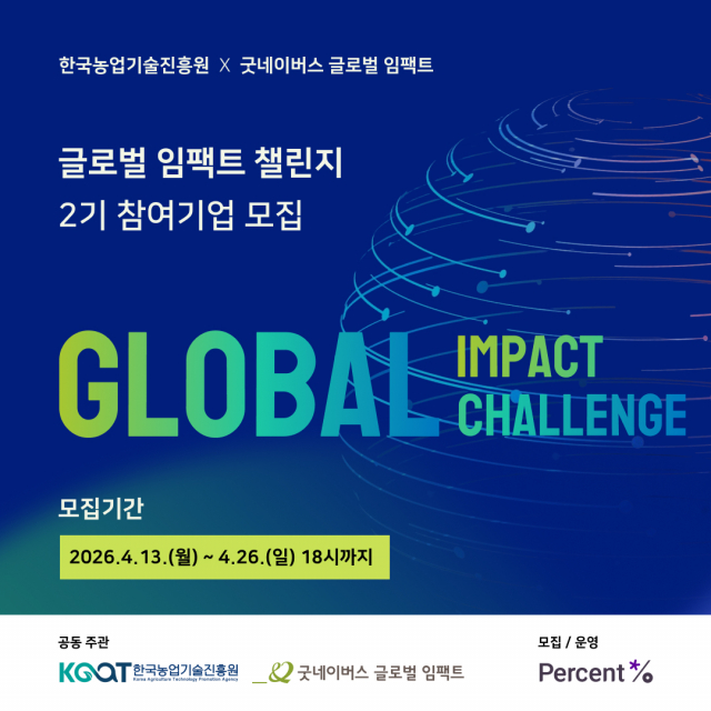 ‘글로벌 임팩트 챌린지 2기’ 모집 요강과 세부 내용은 굿네이버스 글로벌 임팩트 홈페이지와 농진원 농식품창업정보망에서 확인할 수 있다. 프로그램 모집과 운영은 사회문제 해결형 비즈니스와 ESG 분야 스타트업 대상 기술창업 교육을 수행해 온 퍼센트가 담당한다.