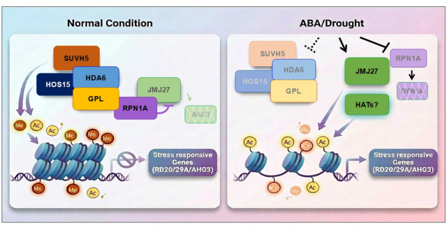 건국대학교 글로벌식물스트레스연구센터(Global Plant Stress Research Center) 윤대진 교수 연구팀이 식물이 가뭄과 같은 환경 스트레스에 적응하는 과정에서 작동하는 새로운 후성유전 기반 유전자 조절 메커니즘을 규명했다. 연구팀은 GPS2-like 단백질이 HOS15 단백질 및 히스톤 탈아세틸화 효소 HDA6와 함께 전사 억제 복합체를 형성해 식물 호르몬 ABA(앱시스산, Abscisic Acid) 신호전달과 가뭄 적응 반응을 정밀하게 조절한다는 사실을 밝혔다.