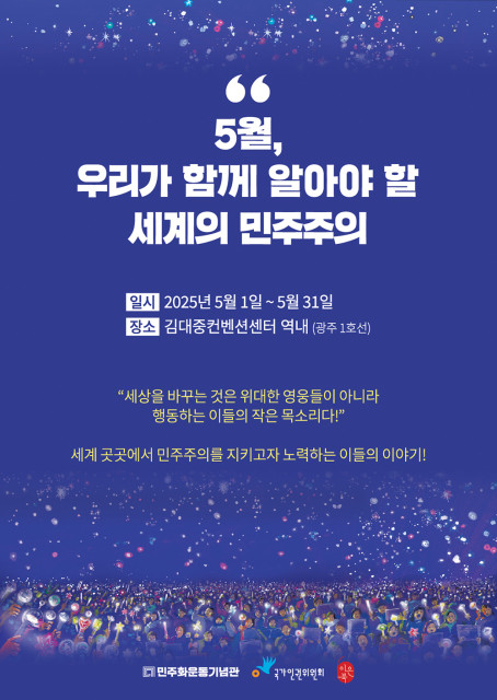 5월은 민주주의의 가치를 다시 한번 되새기는 달이다. 특히 올해 5월은 ‘5·18민주화운동’ 45주년과 ‘2025세계인권도시포럼’이 열리는 뜻깊은 달로, 이번 전시는 세계 곳곳에서 민주주의를 지키기 위해 싸워 온 시민들의 이야기를 통해 우리 모두가 민주주의의 의미를 새롭게 되새길 수 있는 자리가 될 것이다.