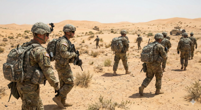 고온의 사막 환경에서 완전군장으로 전술 훈련 중인 미군 장병들의 모습. 이러한 극한의 환경은 전투화 내부의 심각한 땀 발생과 습기를 유발해 이를 해결할 고기능성 전술 양말이 필수적이다. 윤미경연구소는 이 같은 극한 환경에 대비한 미군용 납품 양말 개발에 착수했다(Gemini 생성 이미지)
