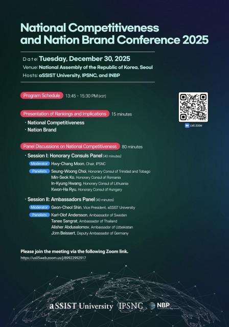 국제경쟁력연구원(IPSNC)과 국가브랜드진흥원(NBP)은 오는 12월 30일(화) 오후 1시, 서울 여의도 국회도서관 대강당에서 ‘2025 국가경쟁력·국가브랜드 콘퍼런스’를 공동 개최한다.