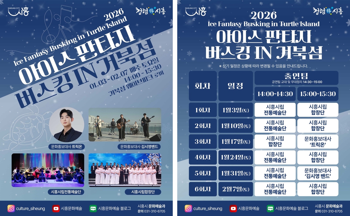 시흥시(시장 임병택)는 지난 연말에 진행된 '2025 시흥 사운드 오브 윈터'의 열기를 잇는 후속 문화예술 프로그램으로, 겨울철 거북섬을 찾는 시민과 관광객에게 풍성한 즐길 거리를 제공하고자 '2026 아이스 판타지 버스킹 인 거북섬'을 운영한다.