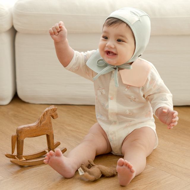 특히 바디수트는 착용·탈의 편의성과 실용성을 중점으로 개발됐다. 하의 스냅 버튼 구조를 적용해 기저귀 교체 시 옷을 모두 벗기지 않아도 돼 외출했을 때는 물론 집 안에서도 간편하게 착용할 수 있다. 또한 실내복과 외출복의 경계를 허문 원마일 웨어(One-mile wear)로 설계해 집에서는 편안한 실내복으로 입힐 수 있고 가벼운 외출이나 병원 방문 시에는 단독 착용만으로 자연스러운 스타일링이 가능하다.