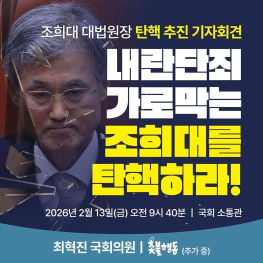 최혁진 무소속 의원과 시민단체 촛불행동이 조희대 대법원장에 대한 탄핵 추진을 공식 선언했다.