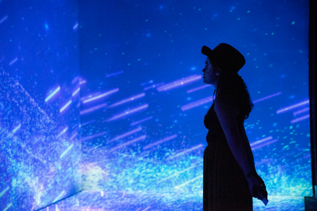 별자리 미디어아트를 감상하고 있는 외국인 관광객
