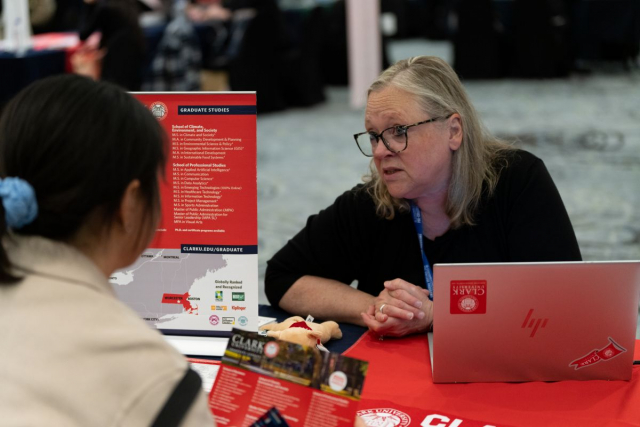 QS 박람회에서 행사 참가자가 학교 담당자와 대화를 나누고 있다