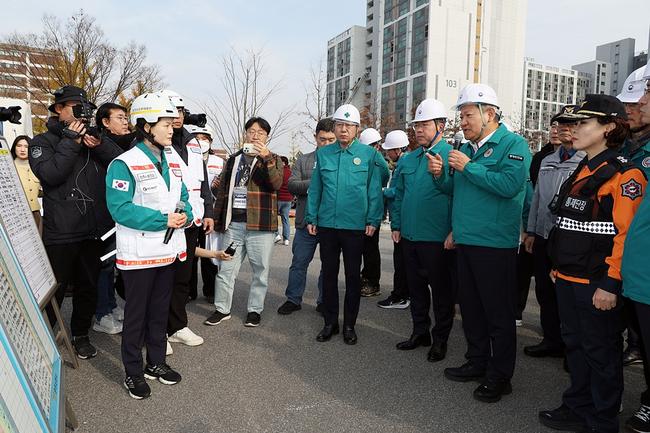 이상민 행정안전부 장관이 20일 오후 전북 전주시에서 실시한 레디 코리아 4차 훈련에 참가하여 아파트 전기차 화재 범정부 대응체계 등 현장 상황을 점검하고 있다.