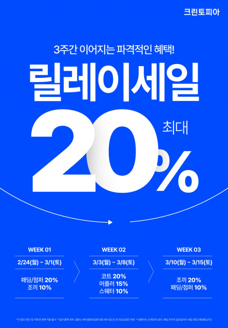 세탁 전문 기업 크린토피아가 봄맞이 옷장 정리 시즌에 맞춰 2월 24일부터 3월 15일까지 ‘릴레이 세일’을 실시한다.