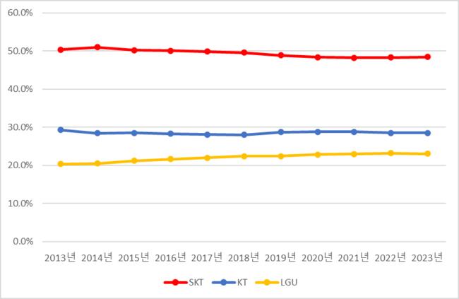 이동통신 3사간 휴대폰 회선(MVNO 제외) 점유율 추이