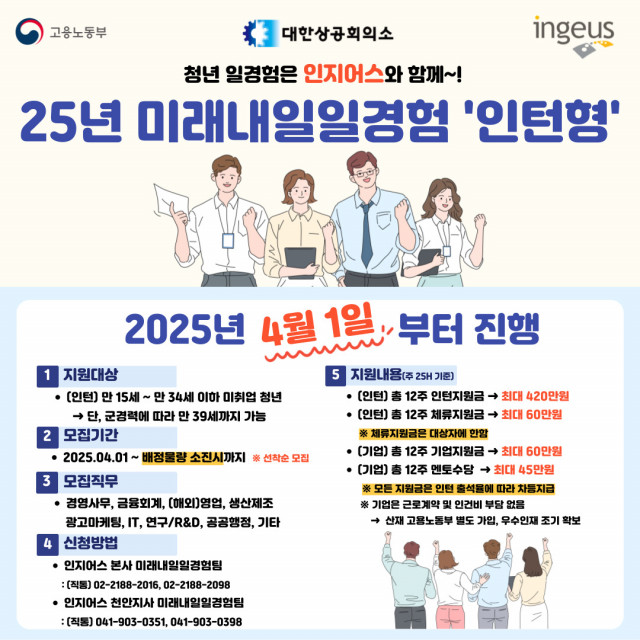국내 최대 고용서비스기업 인지어스(대표 정형우)가 청년들의 성공적인 취업을 지원하기 위해 ‘미래내일일경험’ 프로그램 참여자를 모집한다고 밝혔다.